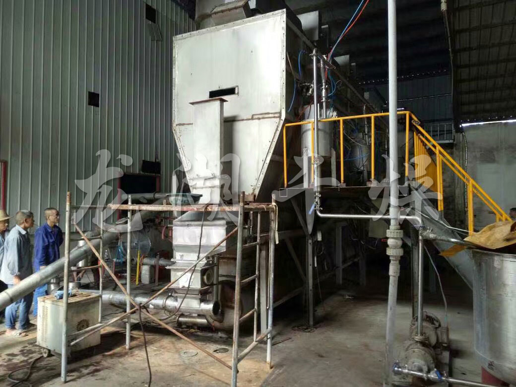 散粒狀固體物料由加料器加入流化床干燥器中,過(guò)濾后的潔凈空氣加熱后由鼓風(fēng)機(jī)送入流化床底部經(jīng)分布板與固體物料接觸,形成流態(tài)化達(dá)到氣固的熱質(zhì)交換。物料干燥后由排料口排出,廢氣由沸騰床頂部排出經(jīng)旋風(fēng)除塵器組和布袋除塵器回收固體粉料后排空。