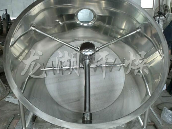 空氣經(jīng)加熱凈化后,由引風(fēng)機(jī)從下部導(dǎo)入,穿過料斗的孔洞板。在工作室內(nèi),經(jīng)攪拌和負(fù)壓作用形成流態(tài)化,水份快速蒸發(fā)后隨著排氣帶走,物料快速干燥。